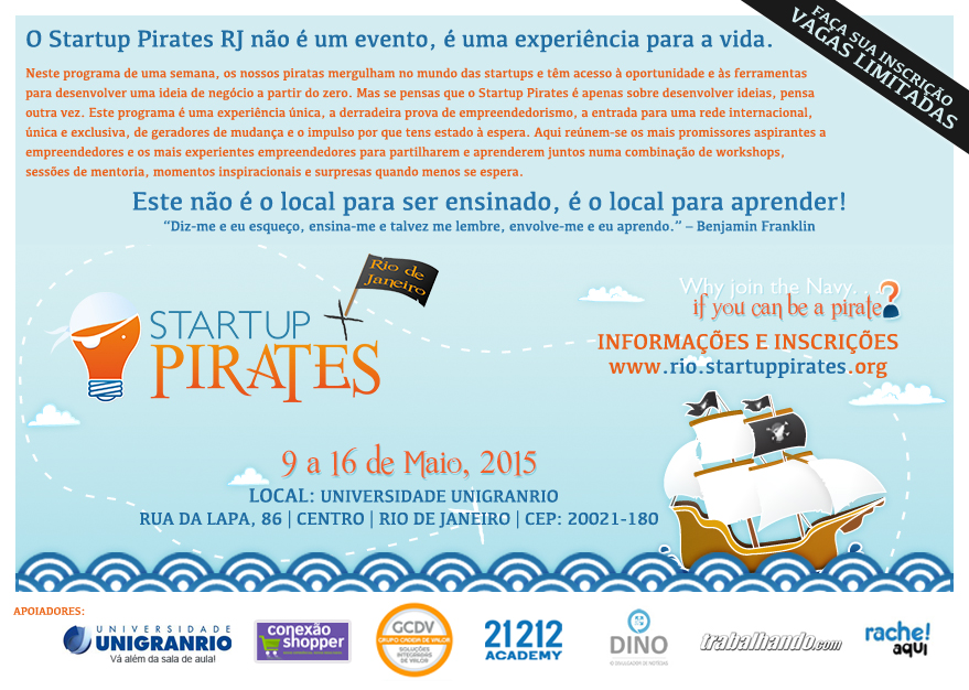 Convido todos para conhecer a iniciativa Startup Pirates, um programa internacional de uma semana, onde os participantes mergulham no mundo das startups e têm acesso à oportunidade e às ferramentas para desenvolver uma ideia de negócio a partir do zero.
